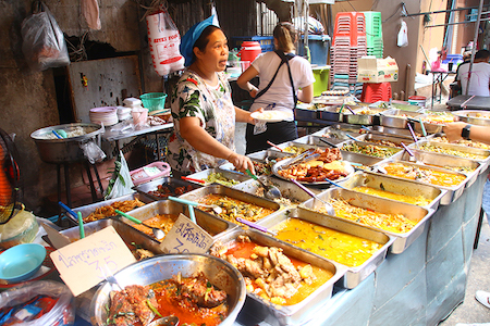 時代が進むにつれて、屋台や市場、学校の前などで「カオゲーン屋(ร้านข้าวแกง / ラーン・カオゲーン)」が一般的になります。