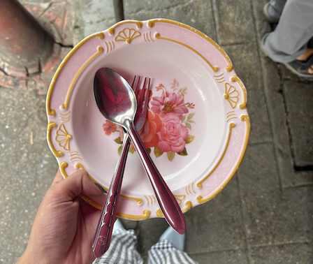 陽気なお兄さんに50バーツを支払うと(現金またはQR決済のみです。クレジットカードは使えないので注意!)お兄さんからお皿とフォーク・スプーンが渡されます。