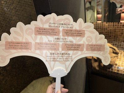 お部屋に置いてあったうちわが指差しタイ語帳になっていて、マッサージの強さや空調などについてマッサージ師さんとコミュニケーションが取れるようになっています。