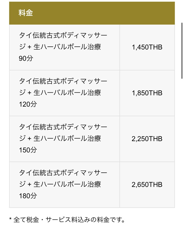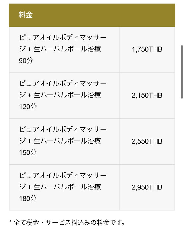 ハーバルボール付きは90分~です。90分のもので、タイ古式60分+ハーバルボール30分のイメージ。
