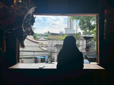 窓の外に広がるの葉タラートノイのレトロな街並み。そして奥にバンコク川沿いのビル群が見えていて、なんだか不思議な気持ちになりました。