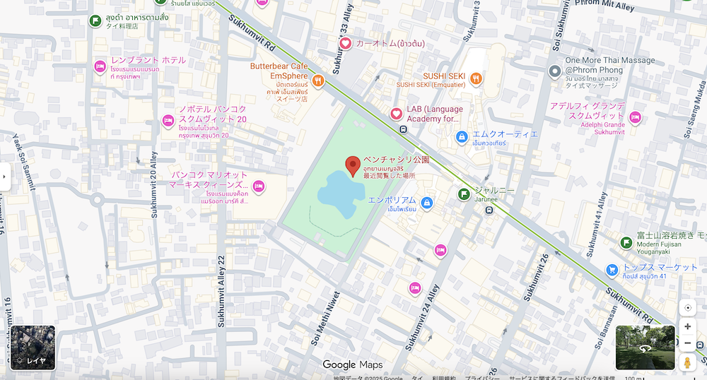 ベンジャシリ公園は、タイ・バンコクのスクンビット通り沿い、BTS スカイトレイン の プロンポン駅(Phrom Phong)近くにあります。公園は「街中のオアシス」として、大型ショッピングモール・Emsphereやその近辺の商業/住宅エリアと隣接しており、非常にアクセスの良い立地です。