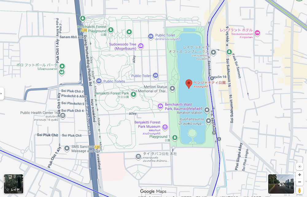 ベンジャキティ公園は、タイ・バンコクの中心部、クローントゥーイ区(Khlong Toei District)にあります。この公園は、アソーク駅〜クイーンシリキット国際会議場(Queen Sirikit National Convention Center/QSNCC)のすぐ近くまで大きく広がっています。