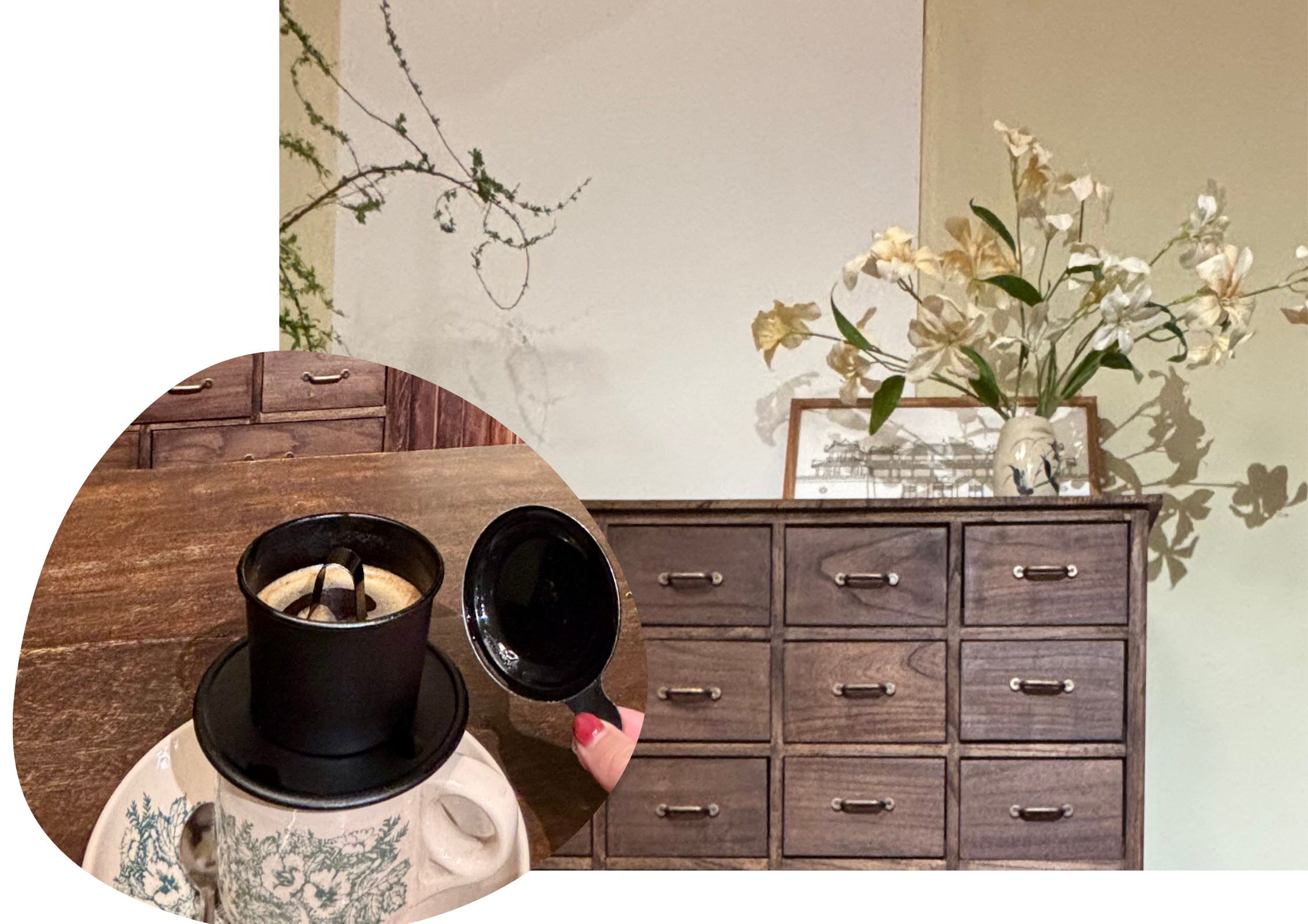 今回のお目当てはシンプルな「ベトナムコーヒー」。ベトナムコーヒーとは、専用の金属フィルターで濃く抽出した力強い苦味のコーヒーに、甘いコンデンスミルクをたっぷり混ぜて楽しむ、濃厚なコクと甘みが特徴のコーヒーのこと。