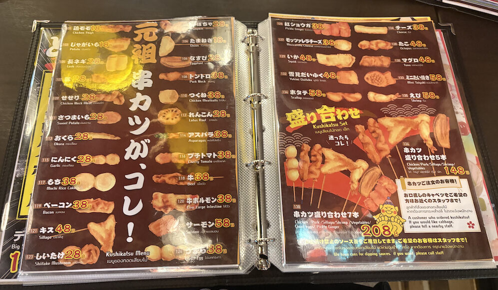 メニューを開くと、左ページに主に単品串、右ページには盛り合わせメニューが並んでおり、5本盛り(180B)・7本盛り(240B)など盛り合わせをセットで頼むこともできます。衣は薄く、串カツながらサクサクと軽い食感で食べることができ、ソースとの相性も抜群です!