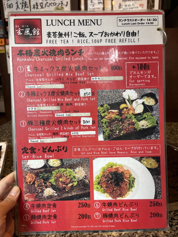 焼肉ランチは300バーツから。麦茶無料でご飯とスープがおかわり自由です。