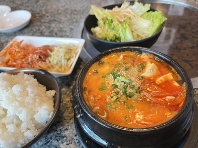 スンドゥブはグツグツと音を立てながら登場。程よい辛さで、ご飯が進みます。
