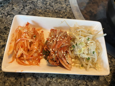 セットの副菜は2種類のキムチとモヤシナムル。酸味が強すぎず、好きな感じです。