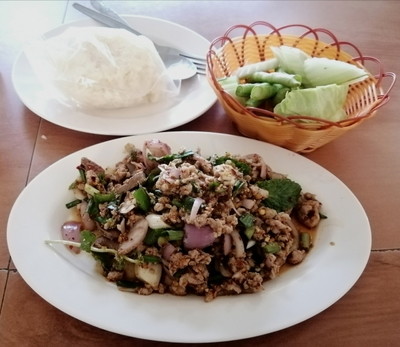ラープはキャベツや白菜の葉に乗せて食べることが多いため、多くのレストランでは付け合わせの葉物野菜がセットでつきます。