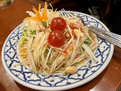 青パパイヤ、ニンジン、キュウリ、インゲンなどたくさんの野菜が入っていて、低カロリーなのにボリューム満点。
