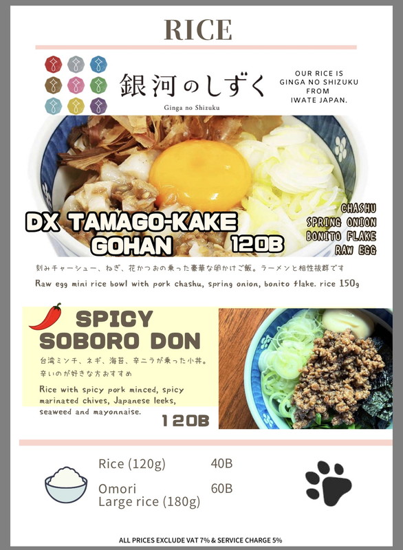 まぜそばと追い飯がまとめて登場。追い飯にはスープが付いてきて、味噌か醤油か選べます。